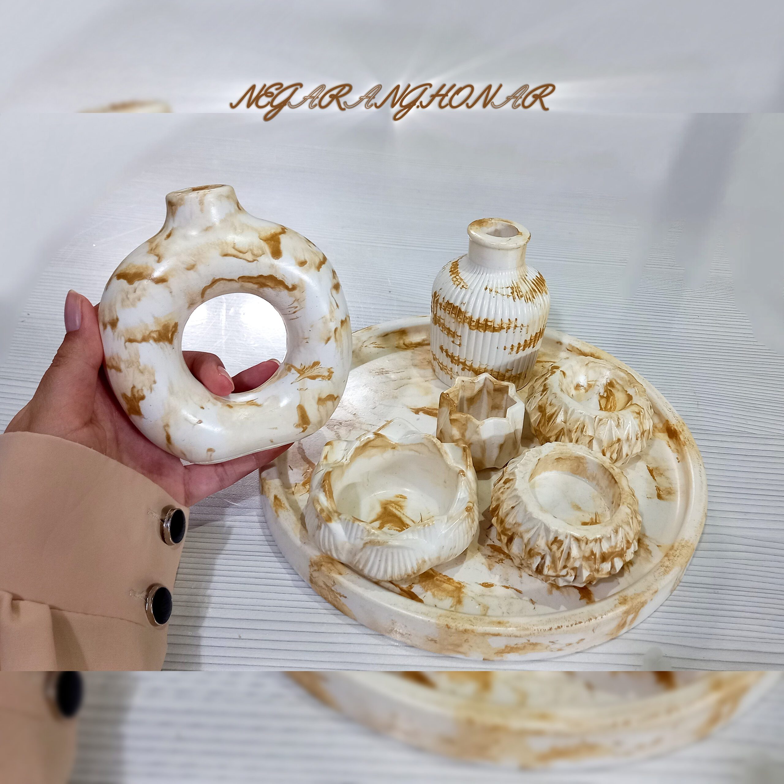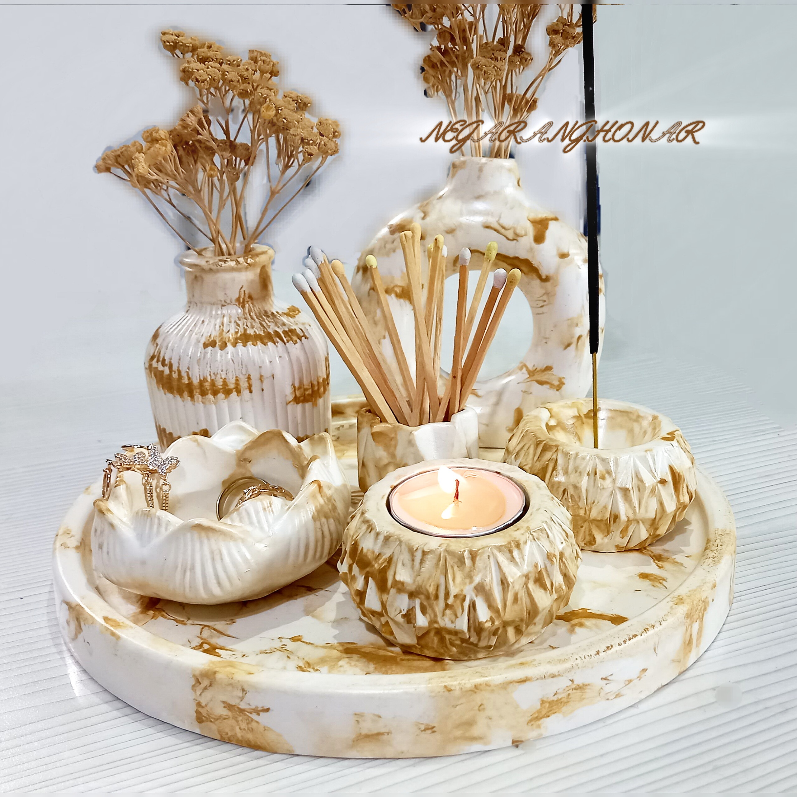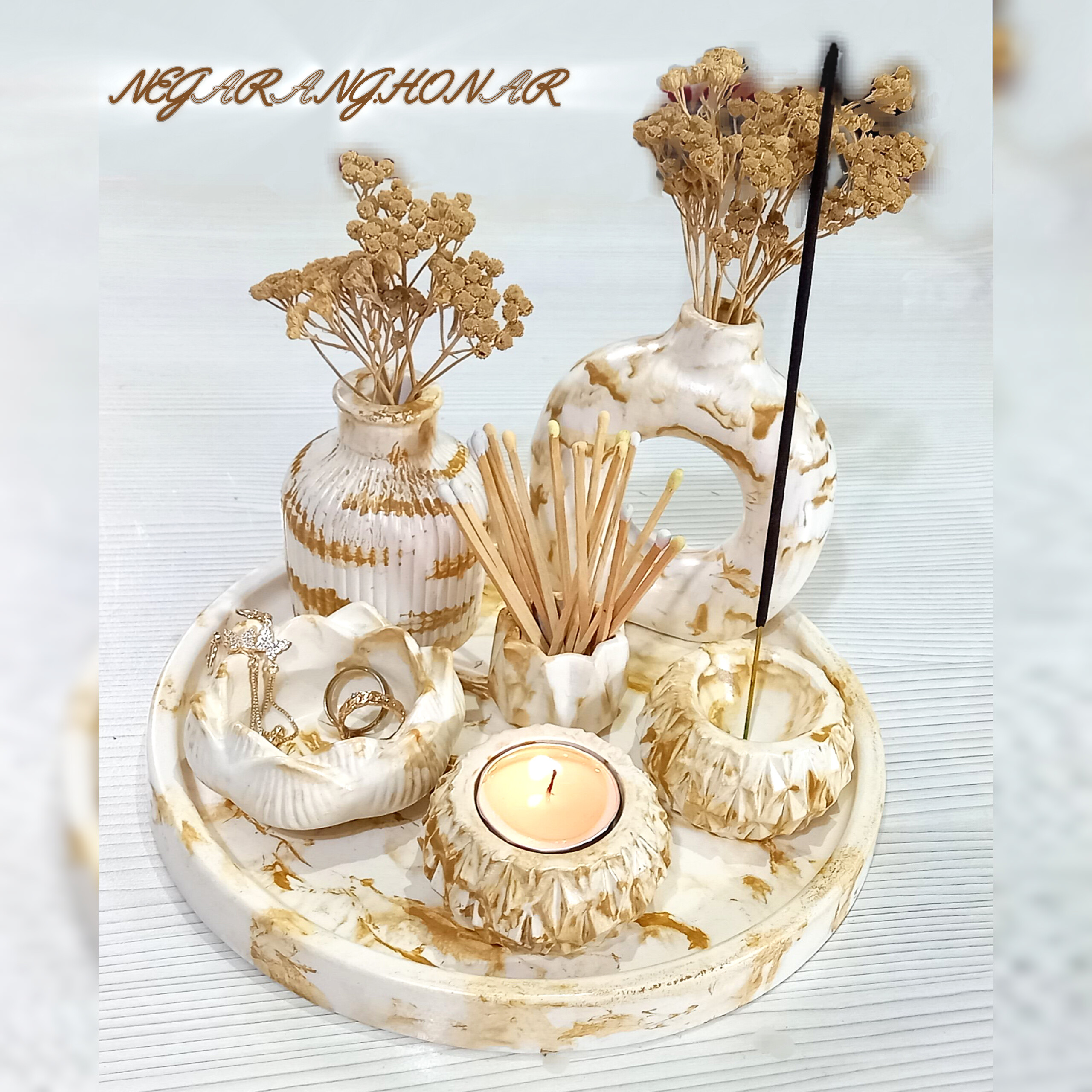 گلدان دونات، عوددان، جای کبریت، جای عود ، دوعدد جای شمع وارمر و سینی گرد.