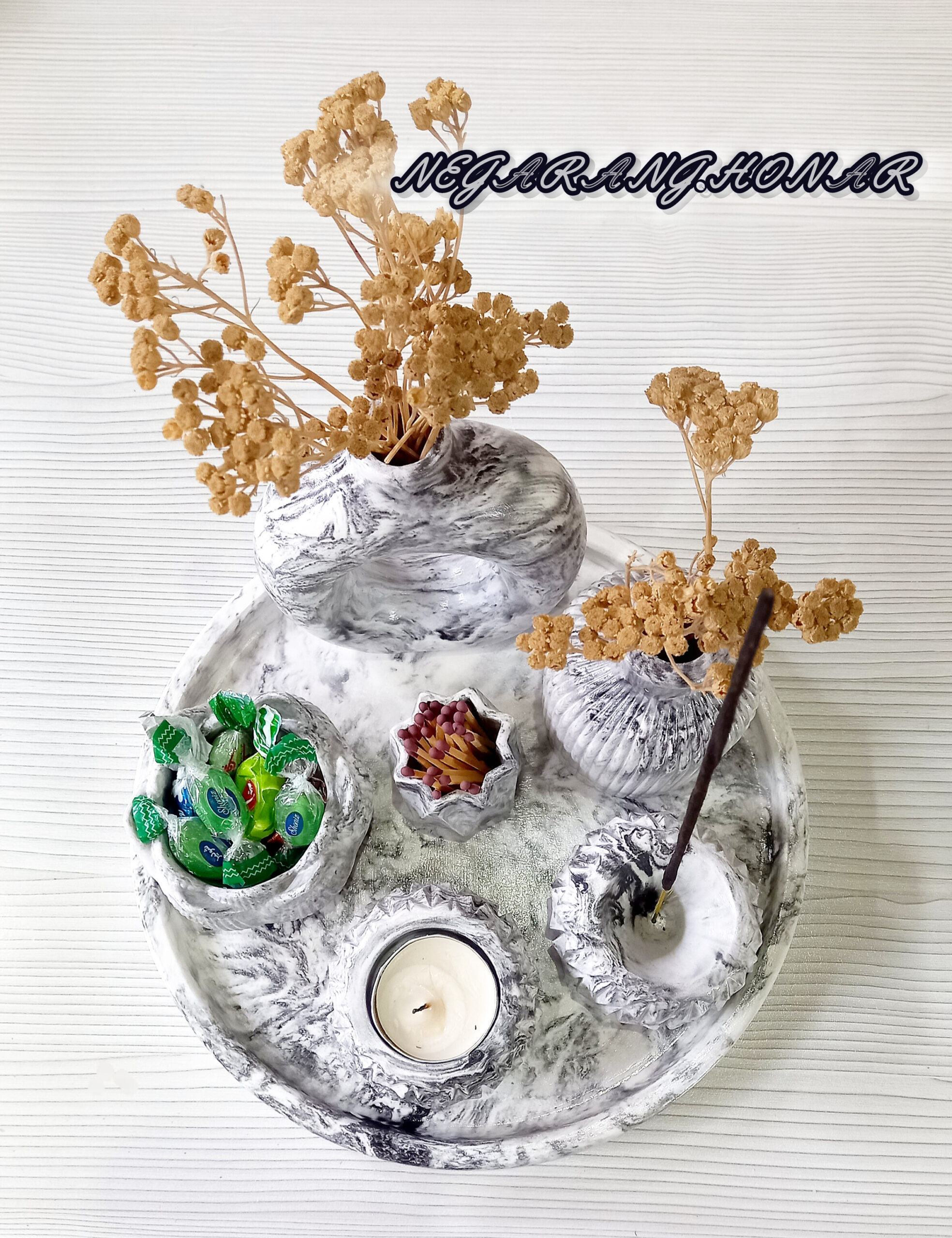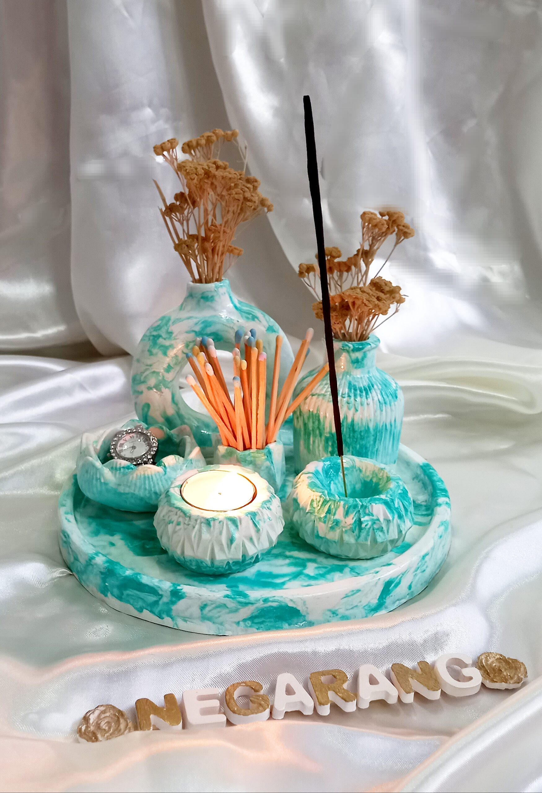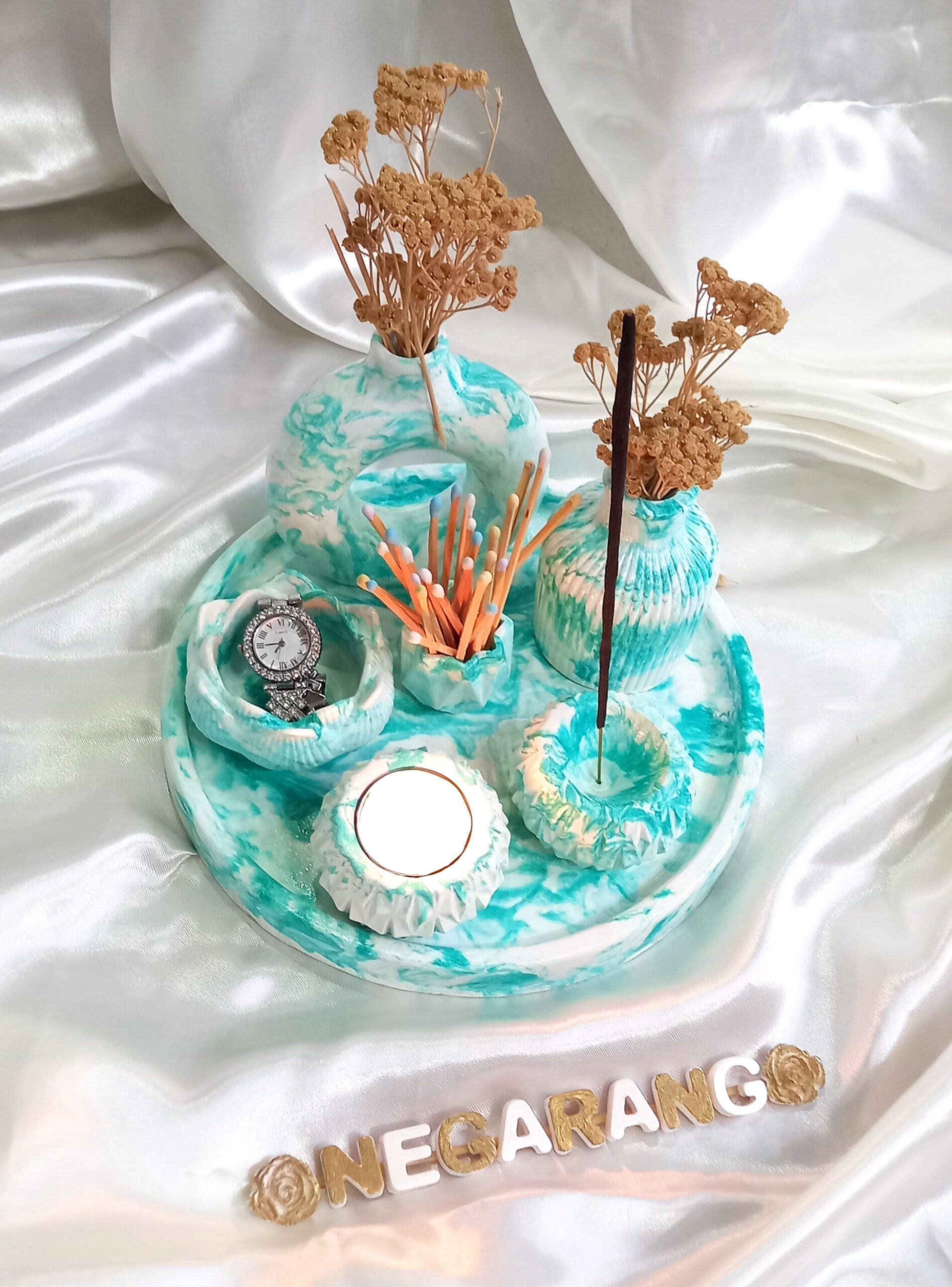 گلدان دونات، عوددان، جای کبریت، جای عود ، دوعدد جای شمع وارمر و سینی گرد.