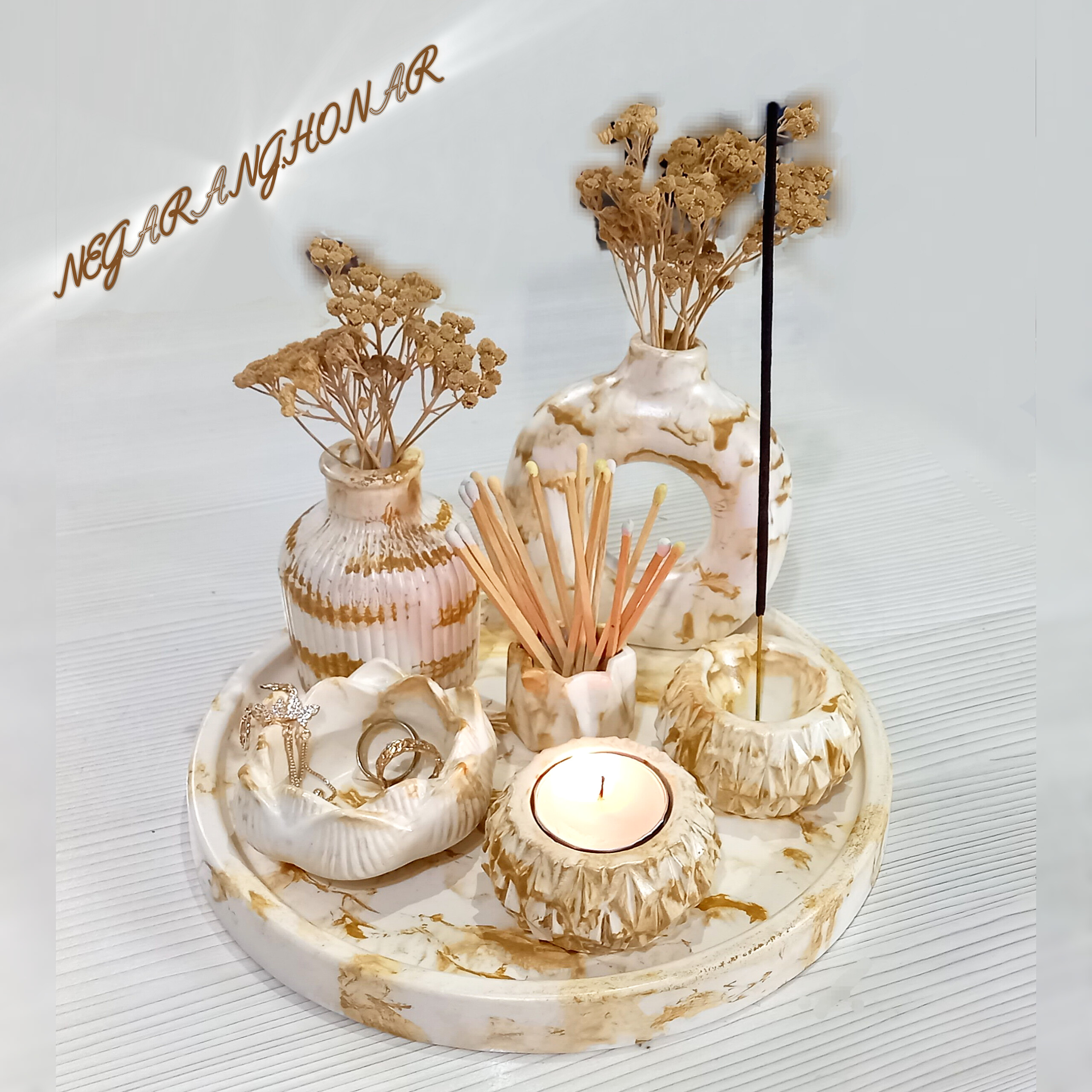 حالا تو این ست ما گلدان و عود دان و جای شمع رو کنار هم آوردیم ، برای خانومایی که بوی خوب، احساس مثبت و دکور شیک و بروز براشون مهمه.